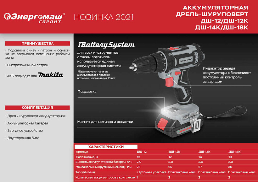Модель оснащена батарей нового поколения с повышенным ресурсом, увеличенной энергоотдачей, пониженным саморазрядом и минимальным временем зарядки. Два Li-Ion аккумулятора на 2.0 Ач обеспечат полную непрерывность в работе.