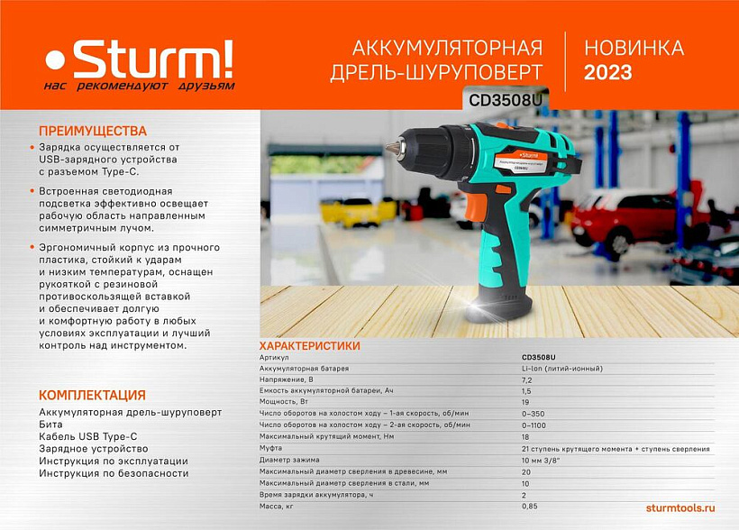 Sturm CD3508U — аккумуляторный 7,2-вольтовый двухскоростной шуруповерт бытового назначения — оптимальное сочетание мощности, компактности и широкого функционала. Модель оснащена производительным 7,2 В электромотором и двухскоростным планетарным механизмом — режим пониженных оборотов (0-350 об/мин) предназначен для работ с крепежом, режим повышенных оборотов (0-1100 об/мин) — для сверления отверстий в различных материалах. Благодаря муфте регулировки усилия на 21 ступень, значение момента затяжки на валу шпинделя можно изменять в широком диапазоне — это дает возможность максимально гибко настраивать инструмент применимо к типам используемых крепежных элементов и их размеру, а также учитывая материал заготовки. Для комфорта пользователя при работе в условиях недостаточной освещенности инструмент оснащен LED-подсветкой рабочей зоны — она имеет нижнее размещение, что предполагает более эффективный охват рабочей зоны и исключение теней от патрона и оснастки. Зарядка шуруповерта осуществляется от USB-зарядного устройства с разъемом Type-C.