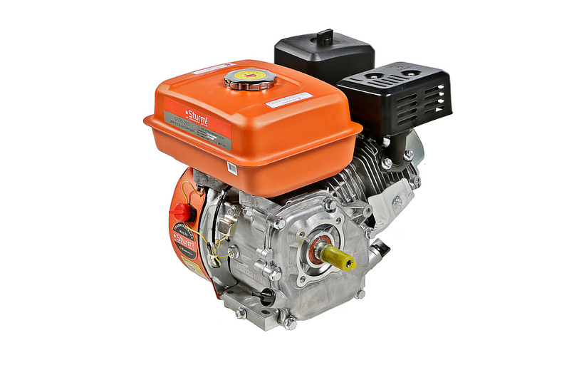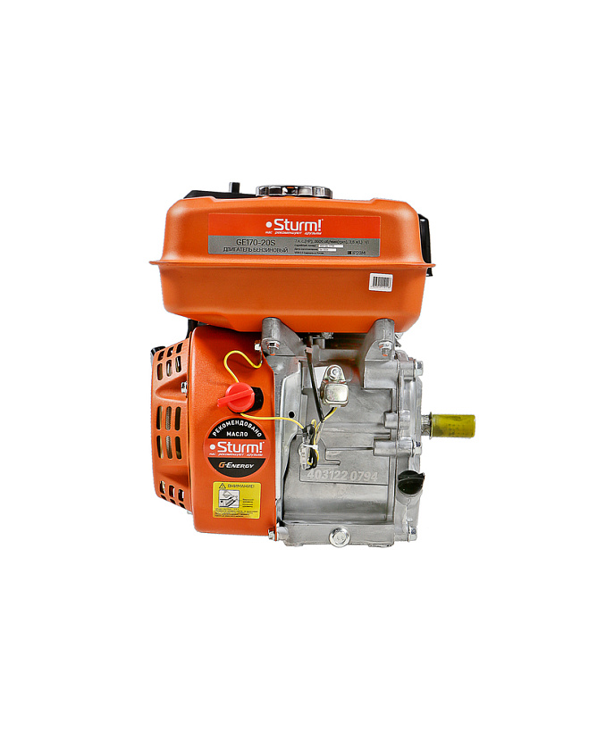 Sturm GE170-20S – четырехтактный одноцилиндровый бензиновый двигатель воздушного охлаждения. Предназначен для установки на мотоблоки, культиваторы, мотопомпы, снегоуборщики, скарификаторы и другую садовую технику. Рабочий объем – 208 см3. Мощность – 5.2 кВт. Характеризуется высокой надежностью, долговечностью и простотой в обслуживании. В конструкции силового агрегата применен ряд хорошо отработанных и проверенных технических решений: покрытая твердым хромом поршневая группа, кованый коленчатый вал, усиленный картер, электронная бесконтактная система зажигания, карбюратор, обеспечивающий стабильность работы при различных температурных условиях. Особенностью модели Sturm GE170-20S является система автоматической остановки и блокировки запуска при низком уровне масла, предотвращающая работу двигателя без наличия достаточного количества масла в картере. Эффективную фильтрацию воздуха на впуске обеспечивает сухой воздушный фильтр. Система запуска – с помощью ручного стартера.