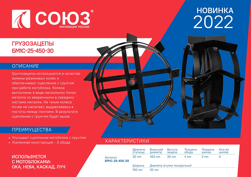 Грунтозацепы СОЮЗ БМС-25-450-30 используются в качестве замены резиновых колес и обеспечивают сцепление с грунтом при работе мотоблока. Колеса выполнены в виде нескольких полос металла со вваренными в середину листами металла. На такие колеса почва не налипает, выдавливаясь в пустоты между лентами. В результате сцепление с грунтом будет выше. Диаметр ступицы 30 мм, диаметр грунтозацепа 450 мм, ширина 180, количество ободов 3, высота зацепа 30мм.