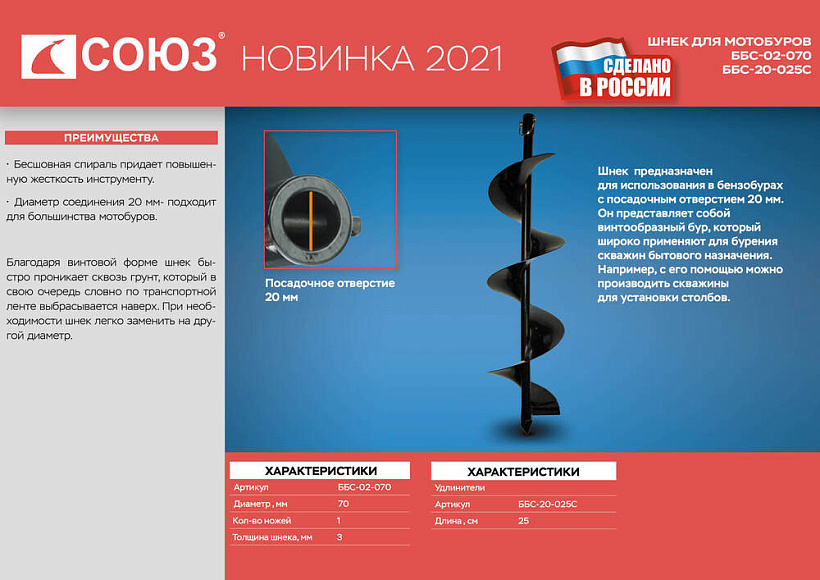 Шнек для мотобуров СОЮЗ ББС-02-070 буровой инструмент, который представляет собой винтовую конструкцию. Оптимально подходит для работы с грунтом. на пример при установке столбов.