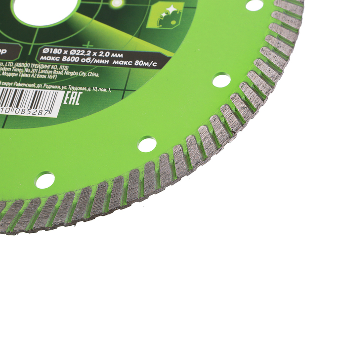 Высокое содержание алмазов и высота режущей кромки 10 мм увеличивают износостойкость и срок эксплуатации диска; технология самозаточки позволяет диску сохранять высокую скорость реза даже при длительной работе; тело диска из стали марки 65Mn для ровного реза, метод горячей опрессовки при производстве для наилучшей адгезии.