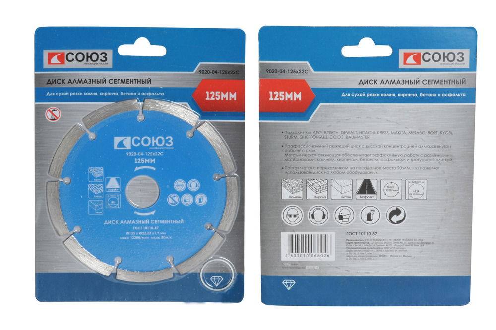 Режущая кромка с оптимальным содержанием алмазного слоя обеспечивает эффективную работу и низкую износостойкость; промежутки между сегментами способствуют лучшему охлаждению и выбросу пыли; тело диска, изготовленное из стали марки 65Г обеспечивает его прочность и упругость; переходное кольцо на 20мм в комплекте