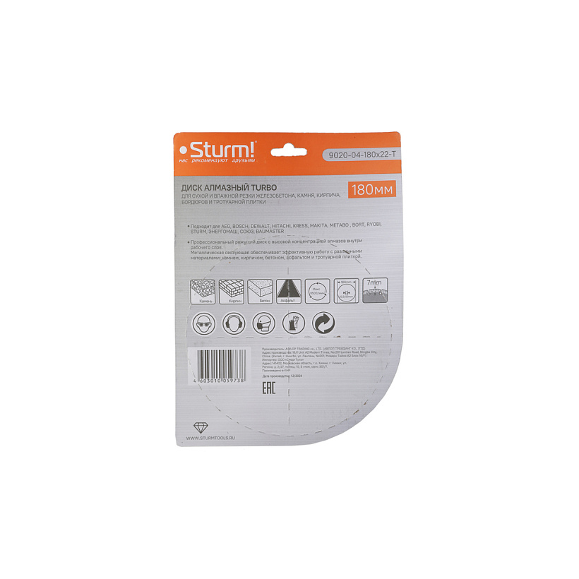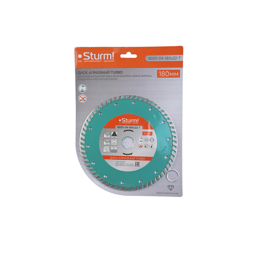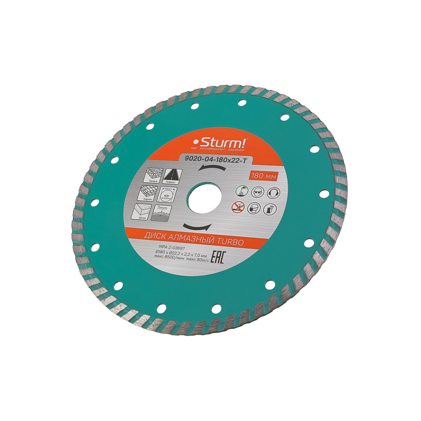 Алмазный диск, сухая резка, "Турбо" 180мм Sturm!