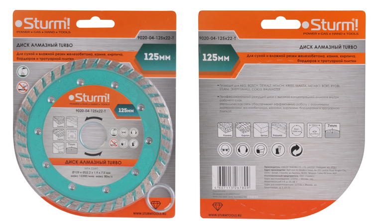 Диск алмазный Sturm! 9020-04-125x22-T с турбо сегментом для сухой и влажной резки различных материалов: камня, кирпича, бетона, железобетона, бордюра и тротуарной плитки. Режущая кромка с оптимальным содержанием алмазного слоя обеспечивает эффективную работу и низкую износостойкость. Турбо сегмент способствуют лучшему охлаждению. Тело диска, изготовленное из стали марки 65Г, обеспечивает его прочность и упругость. Переходное кольцо на 20мм в комплекте для использования с электрическим плиткорезом или иным инструментом.