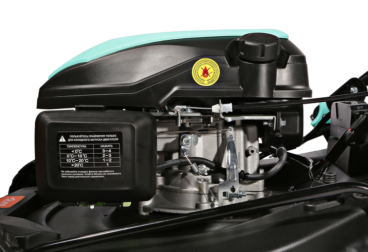 Колеса большого диаметра на подшипниках позволяют косилке легко работать даже на неровных участках и иметь хорошее сцепление с поверхностью.