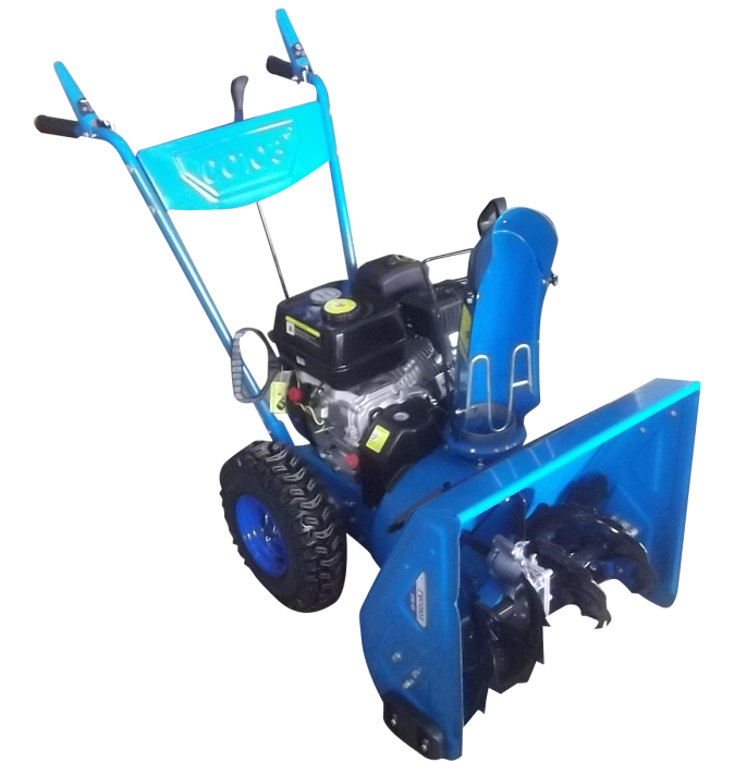 Зазубренный шнек первой ступени успешно измельчает слежавшийся снег и может справиться даже с настом толщиной до 2 см. Высокооборотистая вторая ступень снегоуборочного агрегата отбрасывает снег на расстояние до 12 м. Широкие колеса с развитым анти-снежным протектором позволяют уверенно двигаться по рыхлому снегу. Комбинация электростартёра 12 Вольт и АКБ ёмкостью 7 А*ч делает возможным работу электро стартера автономно.