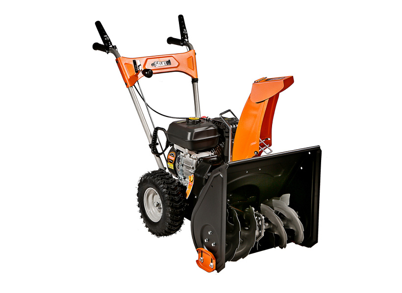 Sturm STG7453 — универсальный самоходный бензиновый снегоуборщик. Предназначен для расчистки территорий от снега различной плотности, как свежевыпавшего, так и слежавшегося. Модель оснащена надежным и неприхотливым четырехтактным двигателем KC, специально адаптированным для зимней эксплуатации, а также многоступенчатой трансмиссией, значительно повышающей универсальность машины. Конструкцией предусмотрены четыре скорости движения вперед и одна назад, выбор нужной скорости производится с помощью удобного рычага переключения. Низшая передача применяется при уборке плотно слежавшегося и мокрого снега, средние передачи — для работы со свежевыпавшим снегом, высшая передача — транспортный режим, предназначенный преимущественно для перемещения снегоуборщика. Высокая производительность машины обеспечивается не только мощным двигателем, но и продуманной конструкцией забора снега — этому способствует использование мощных агрессивных шнеков с большим профилем зуба, позволяющих легко справляться даже со слежавшимся снегом и настом, а также вместительного снегозагребного ковша, гарантирующего внушительную ширину прохода и возможность убирать сугробы до полуметра высотой. Снегоуборщик оснащен выпускным желобом с регулировкой как по направлению, так и углу выброса, благодаря чему пользователь без труда может настроить оптимальное расстояние, на которое будет отбрасываться снежная масса. Максимальная дальность выброса достигает 11 метров. Для лучшего сцепления с поверхностью модель комплектуется специальными шинами с глубоким протектором.