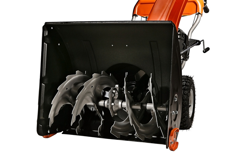 Sturm STG7661 — универсальный самоходный бензиновый снегоуборщик. Предназначен для расчистки территорий средней и большой площади от снега различной плотности, как свежевыпавшего, так и слежавшегося. Модель оснащена надежным четырехтактным двигателем KC, специально адаптированным для зимней эксплуатации, а также многоступенчатой трансмиссией, с шестью скоростями движения вперед и двумя назад. Низшие передачи применяются при уборке плотно слежавшегося и мокрого снега, средние передачи — для работы со свежевыпавшим снегом, высшая передача — транспортный режим, предназначенный преимущественно для перемещения снегоуборщика. Высокая производительность машины обеспечивается не только мощным двигателем, но и продуманной конструкцией забора снега — этому способствует использование мощных агрессивных шнеков большого диаметра (31 см), позволяющих легко справляться даже с плотным слежавшимся снегом и настом, а также применение вместительного снегозагребного ковша, гарантирующего внушительную, одну из лучших в классе, ширину прохода в 61 см и возможность убирать сугробы до полуметра высотой. Снегоуборщик оснащен надежным металлическим выпускным желобом, с регулировкой по направлению выброса. Поворот желоба осуществляется дистанционно, посредством специального рычага на панели. Кроме того, предусмотрена возможность настройки угла выброса, благодаря которой регулируется необходимое расстояние выброса снежной массы. Маневренность и проходимость машины обеспечивают штатные широкие пневматические шины с глубоким протектором.