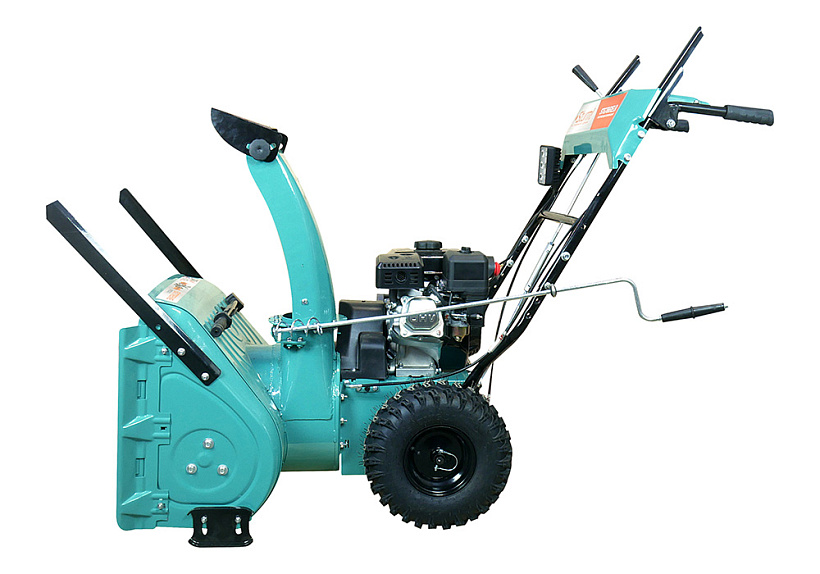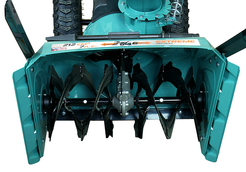Зазубренный шнек первой ступени успешно измельчает слежавшийся снег и может справиться даже с настом толщиной до 2 см. Высокооборотистая вторая ступень снегоуборочного агрегата отбрасывает снег на расстояние до 12 м. Широкие колеса с развитым анти-снежным протектором позволяют уверенно двигаться по рыхлому снегу.