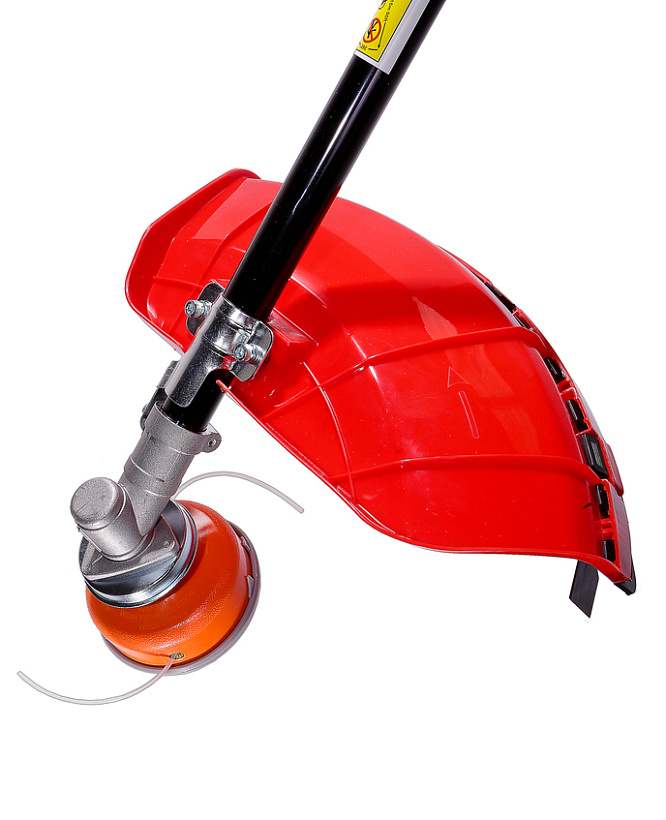 Универсальный защитный кожух можно использовать с ножом- косой для жестких зарослей или кордовой головкой для травы. При этом замена оснастки производится просто и безопасно.