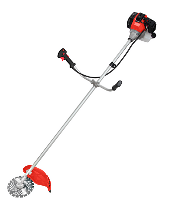 Триммер бензиновый (двигатель с ручкой газа и штанга), боковая рукоятка, режущий диск, плечевой ремень, шпулька с нейлоновой леской, сбруя, канистра для топливной смеси, защитный кожух с винтами (комплект), нож для срезания лески, отвертка с торцевым ключом, шестигранный ключ (2 шт), двухсторонний гаечный ключ, двухсторонняя отвертка, инструкция по эксплуатации, инструкция по безопасности