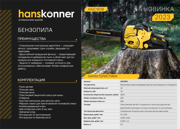 Бензопила Hanskonner HGC1618.