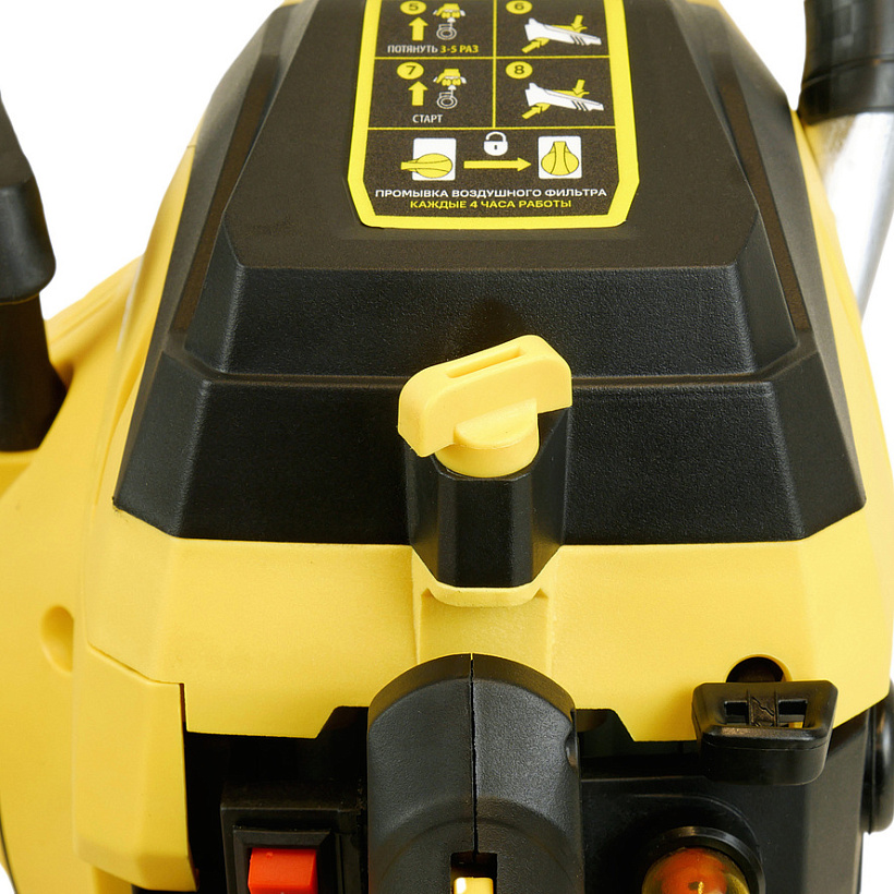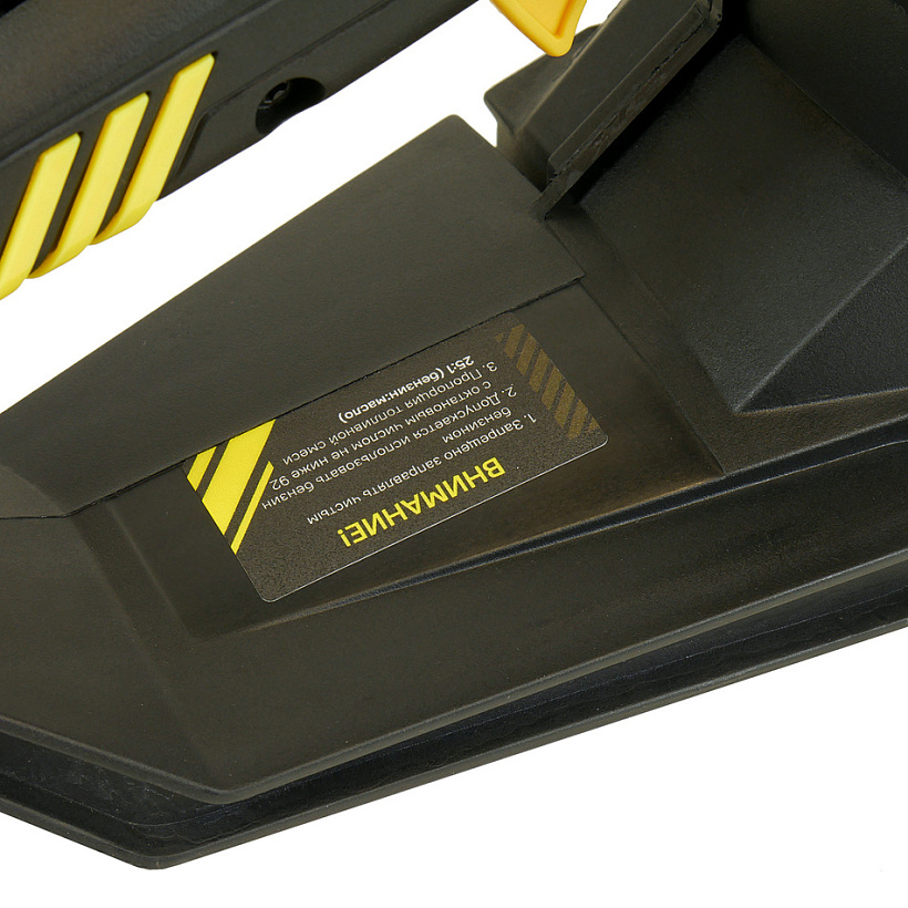 Безопасность работы обеспечивается предохранительной клавишей, предотвращающей случайное нажатие газа, ограничителем цепи, защитным щитком для правой руки, а также цепным тормозом, активируемым принудительно либо силой инерции. Два способа активации тормоза цепи повышают безопасность труда.