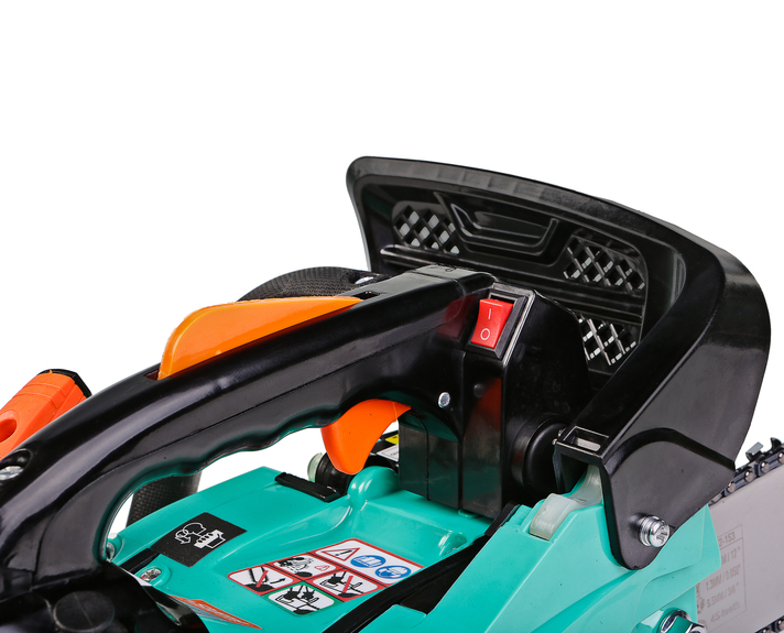 Безопасность работы обеспечивается предохранительной клавишей, предотвращающей случайное нажатие газа, ограничителем цепи, защитным щитком для правой руки, а также цепным тормозом, активируемым принудительно либо силой инерции. Два способа активации тормоза цепи повышают безопасность труда.