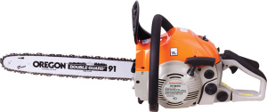 Sturm GC99522B – надежная универсальная бензиновая пила – предназначена для широкого спектра работ: от расчистки лесных насаждений до эксплуатации на приусадебных территориях. Оснащена производительным двухтактным двигателем рабочим объемом 52 куб см (мощность 2.9 кВт / 3.95 л. с.) и пильной гарнитурой увеличенной размерности – 455 мм, что позволяет эффективно использовать инструмент для распиловки древесины различной толщины. В конструкции пилы применен ряд хорошо отработанных и показавших свою эффективность технических решений: хромоникелевое покрытие цилиндра снижает вероятность повреждения его стенок при недостаточной смазке или перегреве, электронная система зажигания гарантирует стабильность работы при различных температурных условиях, бумажный фильтр «автомобильного» типа имеет повышенную степень очистки воздуха, что предотвращает попадание в карбюратор пыли, металлические крышки тормоза и стартера способствуют повышению прочности пилы и уменьшению вибрации. Инструмент обладает отличной эргономикой: на рукояти нанесена специальная насечка для удобства хвата, а их форма обеспечивает лучший контроль пилы при осуществлении горизонтальных пропилов и пропилов под углом. Модель проста в эксплуатации и не вызовет затруднений у начинающих пользователей. Легкость запуска гарантируют система облегченного старта с дополнительной пружиной и праймер, позволяющий уверенный пуск инструмента в условиях низких температур и после длительных перерывов в эксплуатации. Важной особенностью является боковое расположение механизма натяжения цепи, за счет чего существенно упрощается ее регулировка и исключается риск повреждения рук пользователя от случайного контакта с зубьями цепи. Возможность безынструментального доступа к карбюратору, фильтрующему элементу и свече зажигания обеспечивает удобство обслуживания пилы даже в самых неприспособленных условиях.