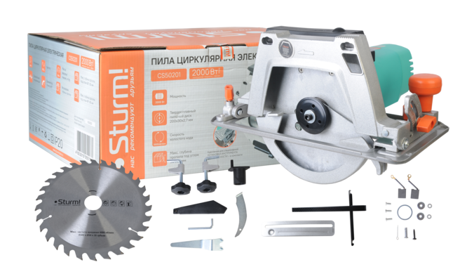 Sturm CS50201 – многофункциональная циркулярная пила с возможностью стационарной установки. Модель оснащена производительным 2000 Вт двигателем, развивающим скорость вращения 5500 об/мин и уверенно справляется с пропилами глубиной до 65 мм. Для предотвращения заклинивания режущего диска во время работы конструкцией предусмотрен специальный расклинивающий нож. Благодаря регулируемой опорной платформе, пользователь может при необходимости настроить оптимальную глубину пропила. Кроме того, опорная платформа имеет возможность регулировки и бесключевой фиксации в наклонном положении на угол до 45 градусов. Для максимально точной установки опорной платформы под требуемым углом предусмотрена специальная шкала с насечкой. Важным достоинством модели Sturm CS50201 является возможность стационарного крепления к рабочему столу диском вверх – инструмент можно использовать как распиловочный станок. Удобство смены оснастки обеспечивает функция блокировки вала шпинделя – с ее помощью замена пильного диска происходит быстро и легко без необходимости применения вспомогательного, стопорящего вал ключа. Наличие системы отвода пыли позволяет эффективно удалять опилки и пыль из зоны резания. Безопасность при работе гарантируют автоматически сдвигающийся в процессе работы защитный кожух, прикрывающий вращающий пильный диск, а также блокиратор кнопки пуска, предотвращающий случайный запуск пилы.