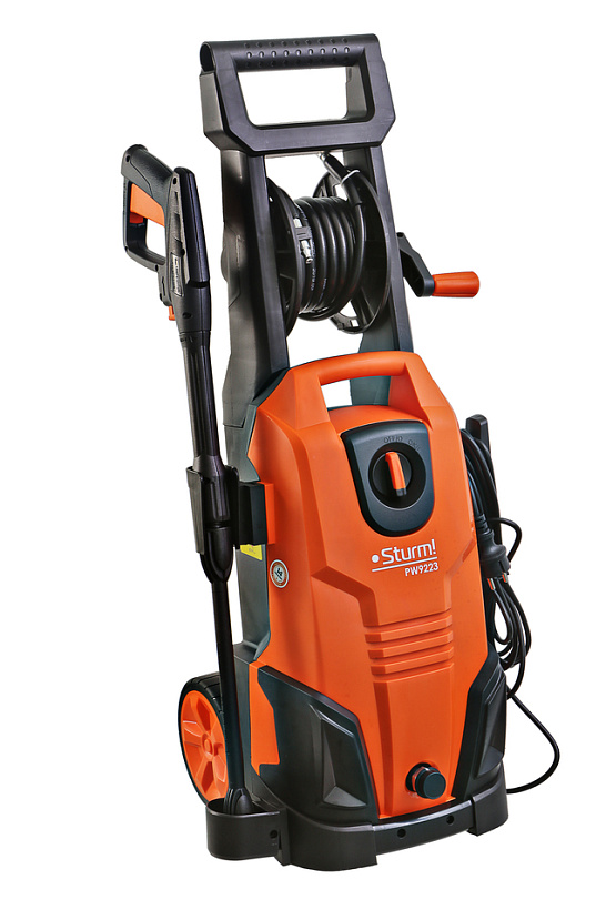 Sturm PW9223 – универсальная мойка высокого давления для бытового использования. Представляет оптимальное сочетание производительности, выверенной эргономики, и широкого функционала. Модель оснащена мощным 2300 Вт электромотором и трёхплунжерной алюминиевой помпой, обеспечивающей производительность в 450 л/час, и высокие показатели по выходному давлению (максимальное давление – 165 бар / рабочее давление – 110 бар) – все это способствует быстрому и эффективному удалению даже самых стойких загрязнений. Входной и выходной патрубки помпы также изготовлены из алюминия, что повышает механическую прочность изделия. Важная особенность мойки Sturm PW9223 – наличие функции самовсасывания, позволяющей полноценную эксплуатацию устройства даже при отсутствии условий для подключения к стационарному водопроводу, используя для забора открытые источники: ведро, бочку или бак. Модель комплектуется длинным семиметровым шлангом высокого давления, обеспечивающим значительную рабочую площадь: с его помощью можно свободно мыть легковой автомобиль, очищать крыши дачных построек и другие объекты без необходимости передвигать мойку с места на место. Для защиты шланга от нежелательных перегибов предусмотрена штатная катушка для его намотки. Легкости подключения шланга и оснастки способствуют специальные быстросъемные соединения QuickConnect. . Безопасную, энергосберегающую и долговечную работу мойки гарантируют встроенная термозащита и автоматическая система с микровыключателем мгновенной остановки двигателя Total Stop. Удобство перемещения достигается благодаря большим транспортировочным колесам.