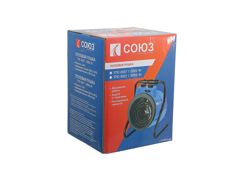 СОЮЗ ТПС-2027 — мощный мобильный обогреватель для временного или постоянного обогрева жилых, производственных и вспомогательных помещений площадью до 30 м2. Модель выполнена в прочном металлическом корпусе, устойчивым к возможным механическим повреждениям и имеет широкую опорную подошву, предотвращающую случайное опрокидывание. Небольшие габариты и вес модели способствуют удобству ее хранения и транспортировки. Обогреватель оснащен классическим нагревательным элементом спирального типа — он обеспечивает не только быстрый прогрев помещения, но и благодаря своей форме в виде спирали устойчив к попаданию внутрь устройства пыли и частиц абразива. Наличие мощного встроенного вентилятора позволяет обеспечить высокую производительность воздушного потока, проходящего через нагревательный элемент и ускорить циркуляцию нагретого воздуха в помещении. Управление обогревателем осуществляется посредством пары регуляторов, расположенных на верхней панели. С помощью первого регулятора пользователь выбирает один из двух предусмотренных режимов работы: вентиляция без нагрева/горячий обдув. Второй регулятор — управление настройкой термостата, задача которого — поддержание постоянной температуры в помещении. Безопасность устройства в процессе эксплуатации обеспечивает защита от перегрева.