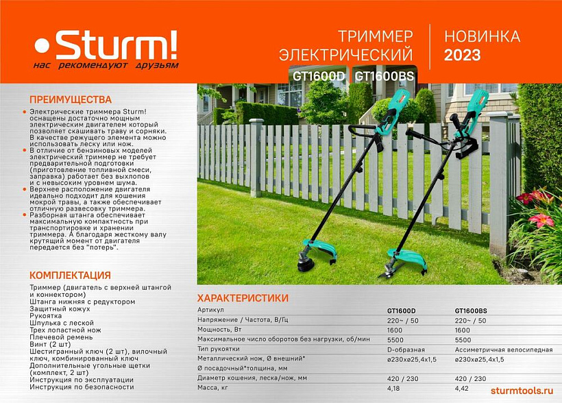 Триммер электрический Sturm! GT1600BS оснащен достаточно мощным электрическим двигателем который позволяет скашивать траву и сорняки. В качестве режущего элемента можно использовать леску или нож.