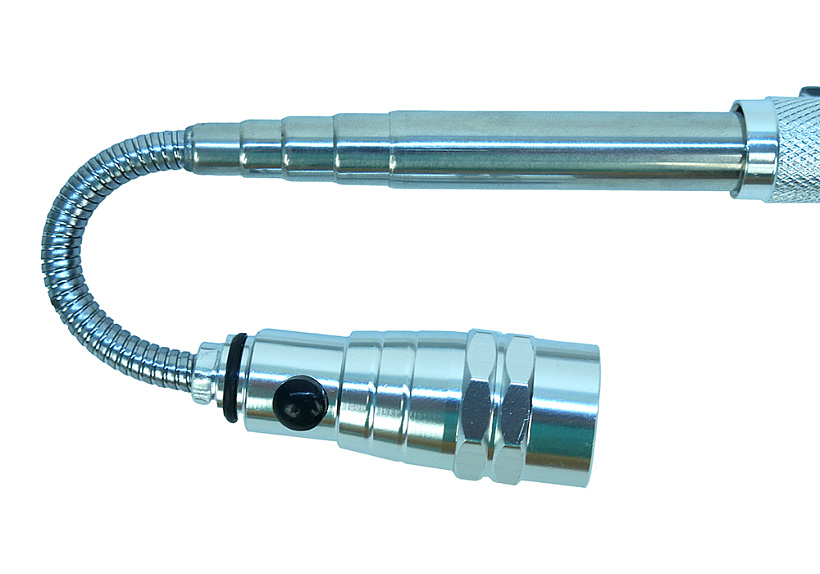 Яркость светодиодов увеличена на 50% по сравнению с аналогами. Гибкий наконечник на телескопическом стержне позволяет подсвечивать рабочую зону под разным углом и в труднодоступных местах.Прочный корпус из алюминиевого сплава оснащен обрезиненной кнопкой выключения и зажимом для переноски на ремне или в кармане.