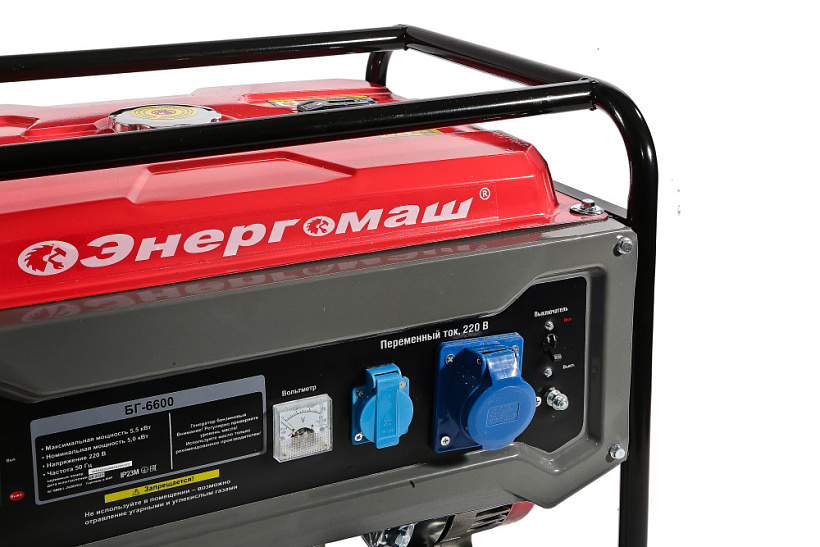 Генератор Энергомаш БГ-6600. Компактный однофазный генератор для организации мобильного энергоснабжения. Аппарат предназначен для мобильного обеспечения электроэнергией потребителей при отсутствии электроснабжения или в походных условиях. Отличный выбор для садового участка, гаража, небольшой торговой точки или организации удаленного рабочего места. Быстрый и легкий запуск двигателя и надежная работа генератора обеспечивается электронной системой зажигания и системой автоматической декомпрессии. Автоматическая система стабилизации напряжения (AVR) выполняет защиту от критичного снижения частоты и перегрузок, опасных для генератора, обеспечивая на выходе ровные параметры «чистой синусоиды», подходящей для большинства энергопотребителей. Прочный рамный каркас из закаленных труб защищает рабочие органы аппарата от механических воздействий и обеспечивают удобство перемещения и простоту установки. Система поддержания энергобезопасности автоматически отключает потребителей от генератора при возникновении короткого замыкания или перегрузки.