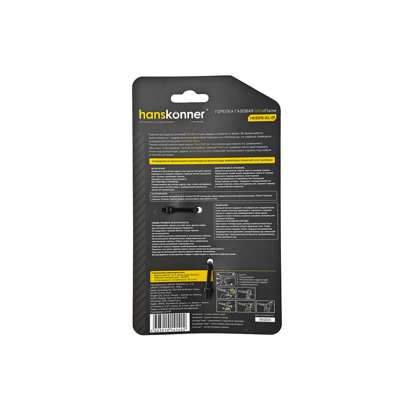 Горелка газовая, пьезоподжиг, защита от вспышек, hanskonner
