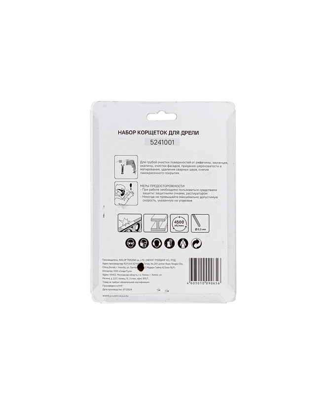 Состав набора : радиальные 2 шт: 50 мм и 75 мм; чашеообразные 2 шт : 50 мм и 75 мм; кистеообразная 1 шт: 25 мм. Диаметр проволоки -0,3 мм, упаковка -блистер