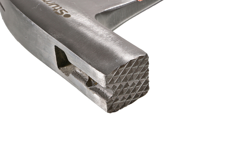 Намагниченная рабочая часть молотка облегчает работу с гвоздями: делает возможным работу одной рукой, например, на высоте. Шляпка гвоздя укладывается в специальную канавку в верхней части молотка и удерживается магнитом, а значит, при первом ударе не нужно держать гвоздь второй рукой.