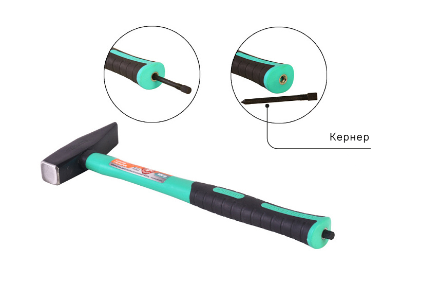 Резьбовая фиксация кернера исключает случайную потерю в ходе рабочего процесса, широкая рифленая захватная часть служит для удобного извлечения и возврата на место, чернение защищает от коррозии. Кованый боёк молотка, защита от раскола, обрезиненная фиберглассовая рукоятка амортизирует удар и создаёт удобный захват