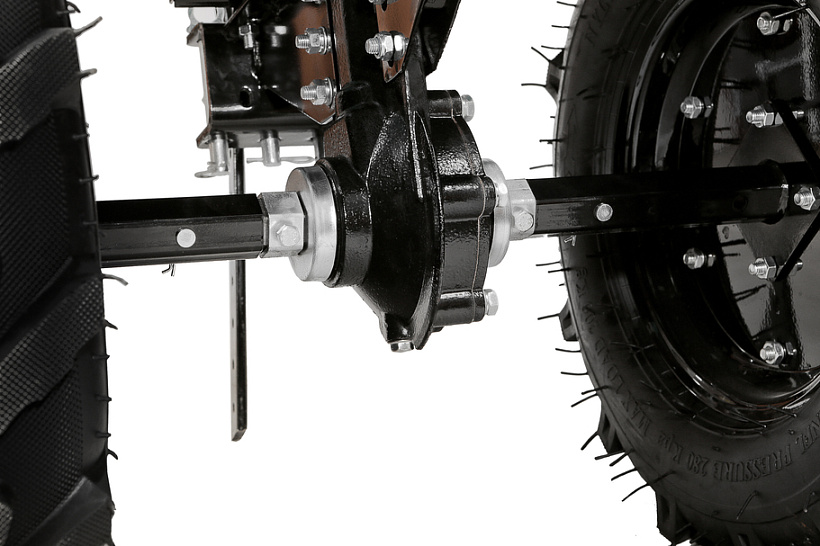 Ведущие колеса мотоблока – это пара стальных дисков с пневматическими шинами, с «болотным» протектором, не допускающим пробуксовки.