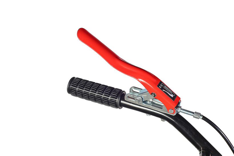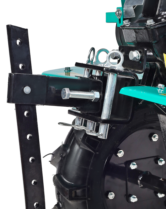 В оснащение мотоблока входит трансмиссия на основе трехступенчатого редуктора (2 ступени переднего хода и одна заднего) с реверсом, пара устойчивых ведущих колес, удобная система управления (рычаги и тумблеры непосредственно на руле). Есть набор устанавливаемых фрез. Ведущие колеса мотоблока – это пара стальных дисков с пневматическими шинами, с «болотным» протектором, не допускающим пробуксовки.