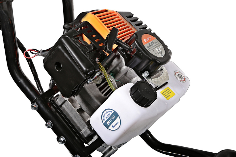 -Инструмент имеет двухтактный двигатель, что предусматривает отсутствие громоздких систем смазки и газораспределения, а также простоту конструкции и обслуживания.