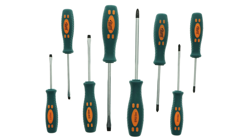 В комплекте 8 отверток: SL5x75; SL5x100; SL6x100; SL8x150;