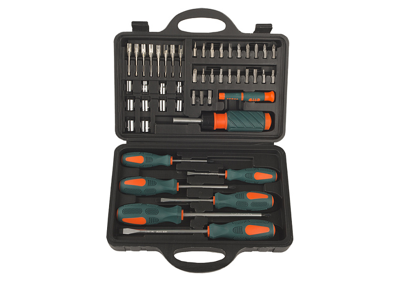 В прочном и удобном пластиковом кейсе: отвертки SL5x75, SL6x100, SL8x150; PH1x75, PH2x100, PH3x150; Держатель с храповиком; Мини ручка, Адаптер, Отвёртки для точной механики: SL1.6x35, SL2.0x35, SL2.4x35, SL3.0x35 мм; PH1.6x35, PH2.0x35, PH2.4x35, PH3.0x35 мм; Торцевые головки: 4.5.6.7.8.9.10.11.12.13 мм; 22 биты: SL3, SL4, SL5, SL6, SL7; PH1, PH2, PH3; PZ1, PZ2, PZ3; TORX: Т10, Т15, Т20, Т25, Т27, Т30, Т40; HEX3, HEX4, HEX5, HEX6
