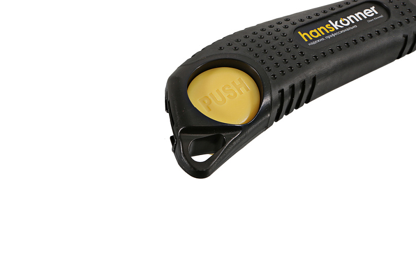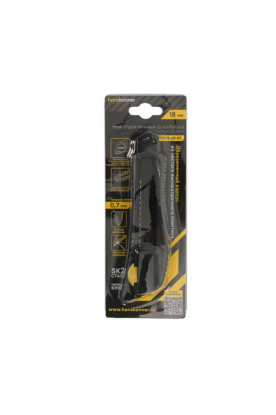 Строительный нож Hanskonner QuickReload (быстрая замена лезвия) подходит для работ с повышенными нагрузками, требующими особой точности и быстрой замены отрабо танного лезвия.. Благодаря сверхпрочной металлической направляющей достигается улучшенная устойчивость конструкции п ри давлении на инструмент. Лёгкий и прочный корпус из высококлассных материалов удобно лежит в руке, а текстурирован ная обрезиненная поверхность с упором под большой палец обеспечивает полный контроль инструмента. Лезвие из высо кокачественной стали SK2 c трёхгранной заточкой и дополнительной обработкой лазером служит в 5 раз дольше стан дартного. Уникальный запатентованный механизм быстрой блокировки/разблокировки направляющей позволит легко заменить лезвие и максимально оперативно вернуться к работе..
