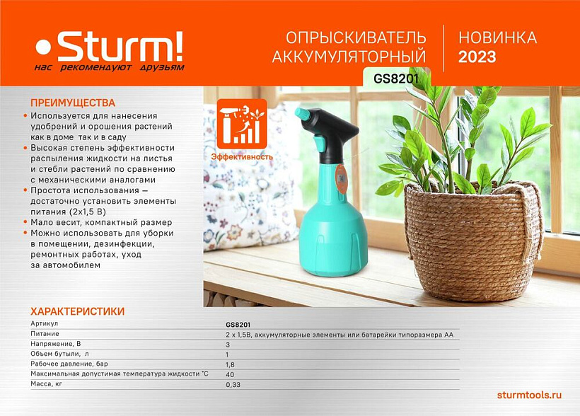 Опрыскиватель садовый Sturm! GS8201, питание 2х1,5 АА элемента