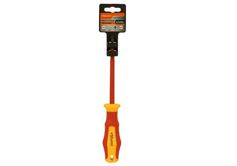 Отвертка Sturm! 1040-17-SL5-125 с многокомпонентной ручкой эргономичной ручкой. Отвертка для безопасной работы на оборудовании с максимально допустимым напряжением 1000 В. Многогранный край ручки для защиты от перекатывания отвёртки на рабочем месте.