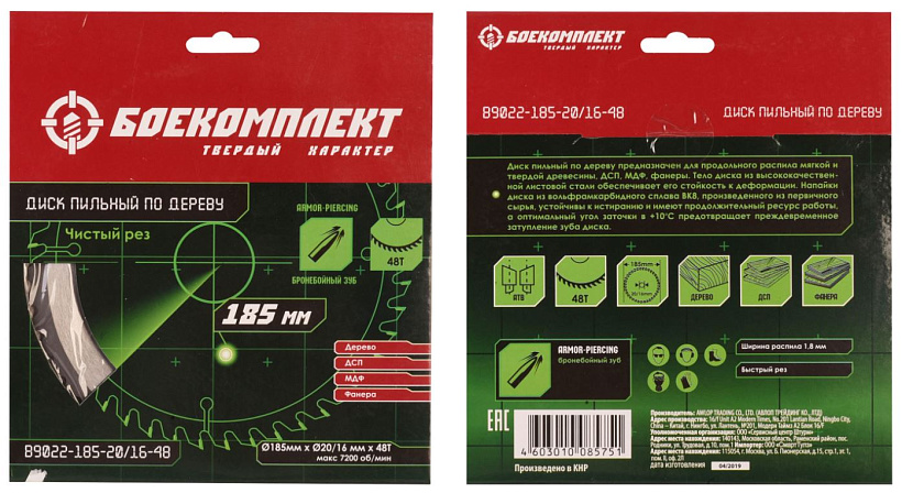 Диск пильный БОЕКОМПЛЕКТ B9022-185-20/16-48. Диск пильный по дереву предназначен для продольного и поперечного распила мягкой и твердой древесины, ДСП, МДФ, фанеры. Тело диска из высококачественной листовой стали обеспечивает его стойкость к деформации. Напайки диска из вольфрамкарбидного сплава ВК8, произведенного из первичного сырья, устойчивы к истиранию и имеют продолжительный ресурс работы, а оптимальный угол заточки в +10  ̊C предотвращает преждевременное затупление зуба диска.