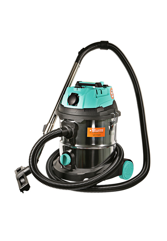 Sturm VC7320 – универсальный строительный пылесос – незаменимый помощник при уборке как в мастерских, так и в бытовых помещениях, офисах, квартирах, салонах автомобилей и т д. Благодаря наличию вместительного 20 литрового бака, пылесос позволяет производить уборку на достаточно больших площадях, без необходимости его частой очистки. Бак изготовлен из нержавеющей стали, что гарантирует стойкость к механическим повреждениям и агрессивным средам. Модель оснащена 1700 Вт электромотором, позволяющим добиться высоких показателей по скорости воздушного потока (до 40 м / с) и разрежению на входе – это способствует быстрому и эффективному удалению мусора, и пыли. Помимо традиционного режима всасывания, конструкцией предусмотрен режим выдува воздуха – он идеально подходит для экспресс-очистки рабочих столов и верстаков, а также очистки штроб и т д. Также, устройство может применяться и для сбора негорючих жидкостей. Для удаления собранной жидкости в нижней части бака предусмотрена сливная горловина. Благодаря мощной системе фильтрации, с применением высокоэффективного HEPA фильтра, предотвращается попадание пыли и абразивных частиц в двигатель. Важной особенностью Sturm VC7320 является функция дистанционной самоочистки фильтра нажатием специальной кнопки в верхней части корпуса. Наличие функции синхронного старта, позволяет использовать пылесос, как единую систему с любым другим инструментом мощностью от 110 до 2000 Вт – при ее активации, запуск пылесоса производится автоматически сразу после запуска основного инструмента, что положительно влияет на удобство работы и позволяет сконцентрировать внимание преимущественно на рабочем процессе, а не вспомогательных операциях. Модель комплектуется металлической телескопической трубкой со ступенчатой регулировкой длины, трехметровым высокопрочным гофрированным шлангом, набором насадок, набором фильтров, мешками пылесборниками, а также универсальным адаптером. Удобству перемещения пылесоса с места на место способствует платформа на 4-х независимых колесах.