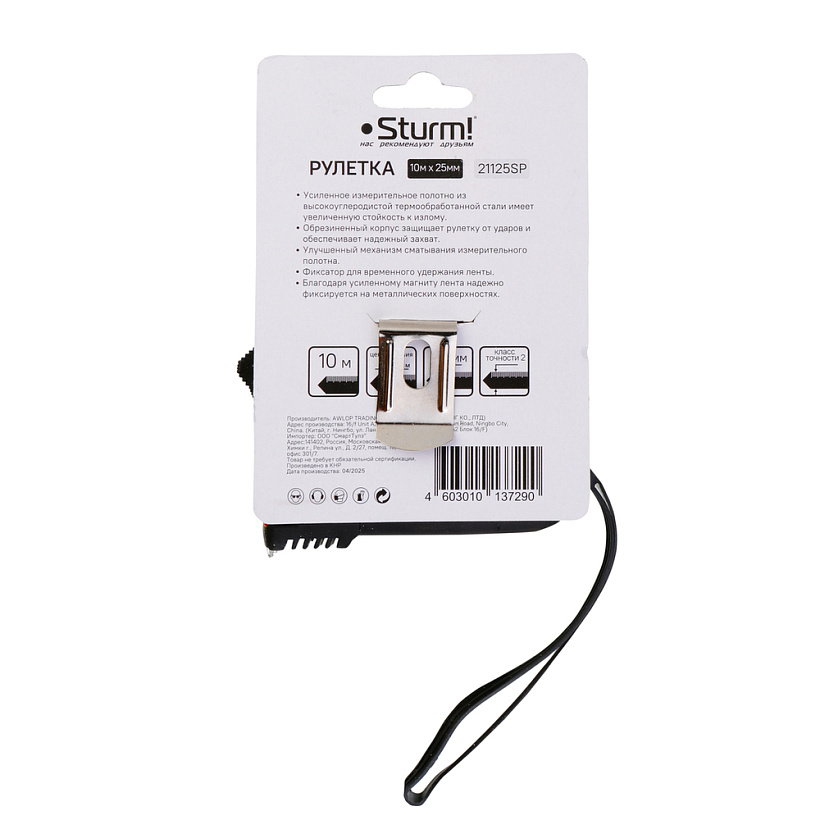 Рулетка 10x25мм, обрезиненная, магнит на зацепе, Sturm!