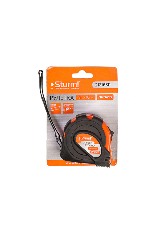 Рулетка 3x16мм, обрезиненная, магнит на зацепе, Sturm!