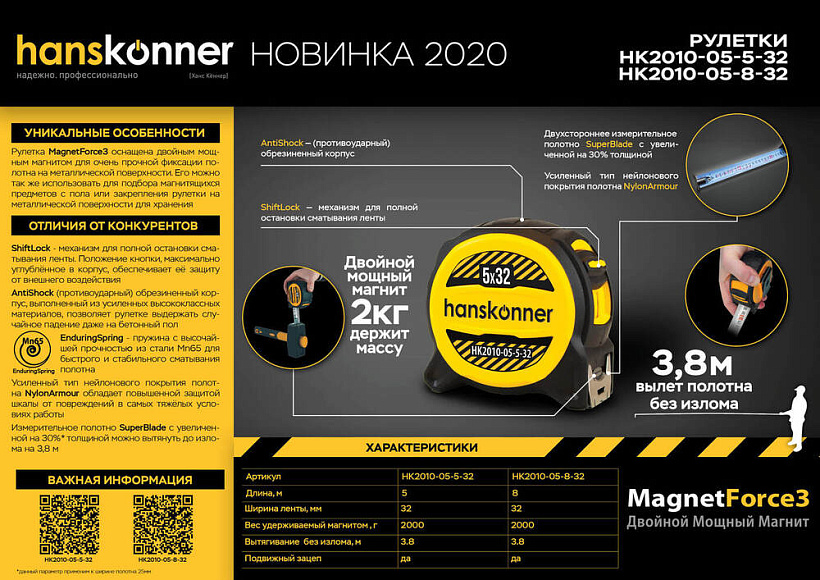 Рулетка Hanskonner HK2010-05-5-32. Рулетка MagnetForce3 5х32 оснащена двойным мощным магнитом для очень прочной фиксации полотна на металлической поверхности. Его можно также использовать для подбора магнитящихся предметов весом до 2кг.