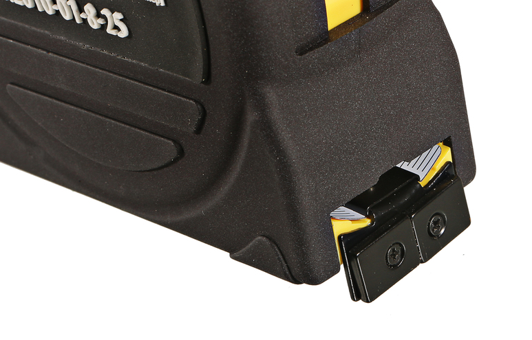Размещение сдвижного фиксатора вверху корпуса обеспечивает безопасность пальцев рук, а амортизирующий демпфер поглощает случайный удар при быстром свертывании мерного полотна.