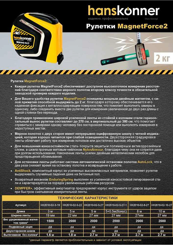 Полотно изготовлено из CrV стали, дополнительно покрыто нейлоном и на 30% толще, чем у обычных рулеток - более дальний вылет без излома и устойчивость к внешнему воздействиюДвойной ниодимовый магнит может выдерживать массу до 2кг