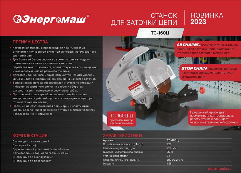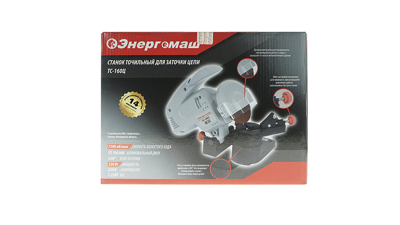 Заточной станок Энергомаш ТС-160Ц. Компактная модель с превосходной практичностью отличается улучшенной системой фиксации затачиваемого элемента цепи.