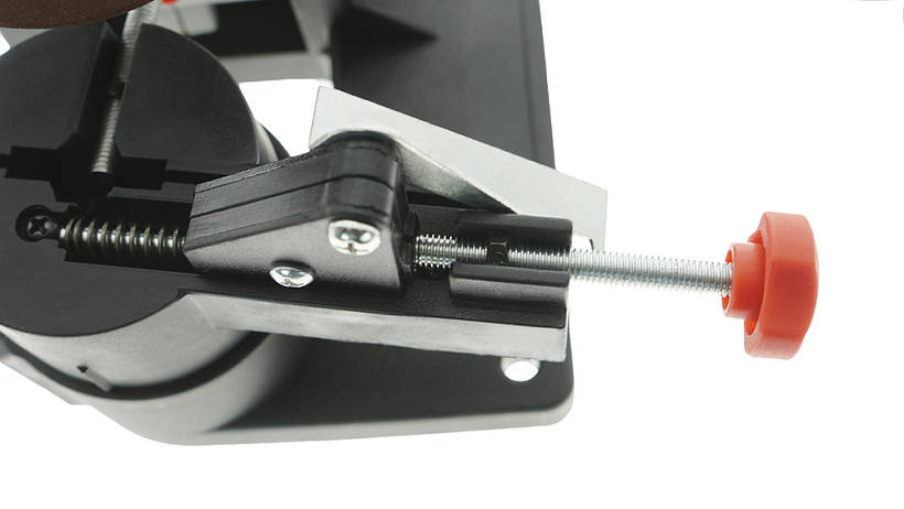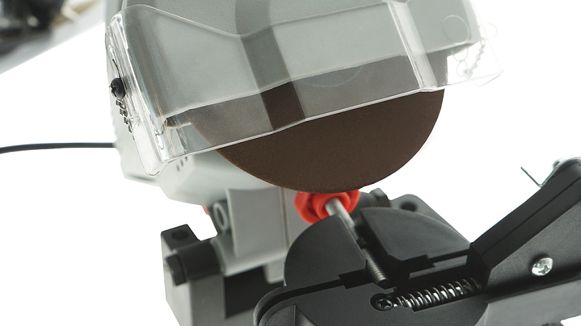 Для большей безопасности во время заточки в модели применена винтовая и клиновая фиксация обрабатываемого элемента, препятствующая его смещению и выскальзыванию из рабочего ручейка. Прижимной механизм обеспечивает точность зажима зубьев цепи под требуемым углом к рабочей поверхности абразивного диска для получения правильной конфигурации режущих плоскостей.