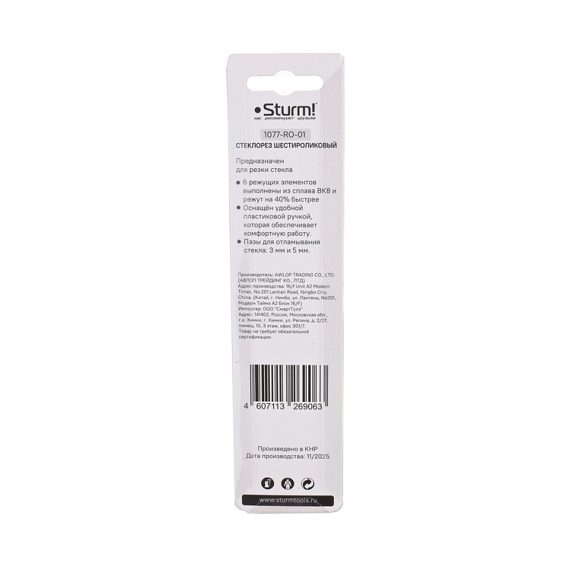 Стеклорез шестироликовый, пластиковая ручка Sturm!