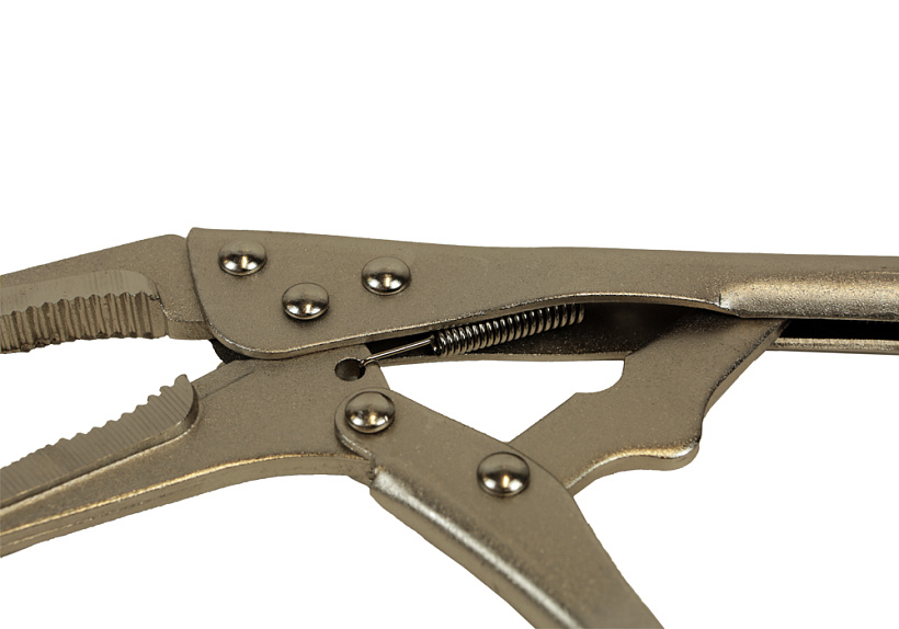 Ручной зажим с фиксатором предназначен для для удержания и надежной фиксации деталей при проведении слесарно-монтажных и сварочных работ. Фиксация происходит при сжатии рукояток инструмента до упора благодаря особой конструкции блокирующего механизма.