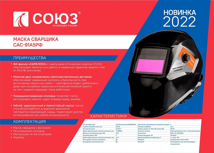 Сварочная маска СОЮЗ САС-91А5РФ. Простая в использовании модель для индивидуальной защиты как от вредного инфракрасного и ультрафиолетового излучения, так и от брызг расплавленного металла.